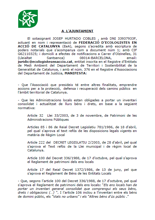 Doncs, donat que és d’interès públic l’efectiva defensa del patrimoni comú que és de tots; donat que els ajuntaments estan obligats a protegir i defensar els camins rurals de la seva titularitat, evitant que aquests béns públics es perdin i, per això, tenen l’obligació d’elaborar un inventari preceptiu dels mateixos; i donat que la majoria d’Ajuntaments de Catalunya no han complimentat aquesta obligació (calculem que només un terç tenen l’Inventari), hem iniciat una campanya en la qual ens hem adreçat a la pràctica totalitat d’aquests Ajuntaments incomplidors, requerint-los de compliment de la seva obligació.